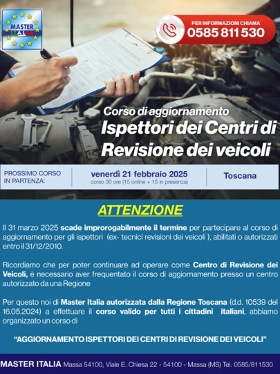 IN BASE AL RICONOSCIMENTO D.D. 10539 DEL 16.05.2024 DELLA REGIONE TOSCANA SIAMO AUTORIZZATI AD EFFETTUARE IL CORSO VALIDO PER TUTTI I CITTADINI ITALIANI DI “AGGIORNAMENTO ISPETTORI DEI CENTRI DI REVISIONE DEI VEICOLI”